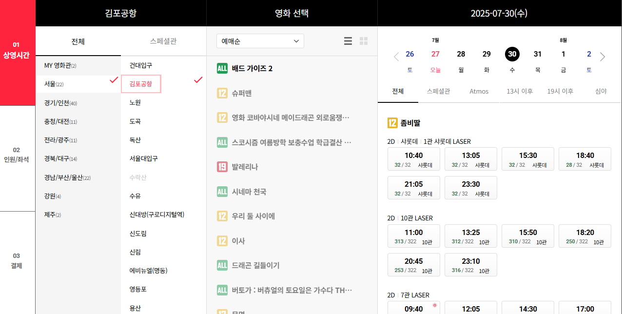 날짜는 2025년 7월 30일, 시간은 오후 5~9시 사이 상영작 선택