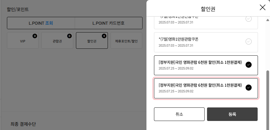 할인권 목록에서 '정부지원 국민 영화관람 6천원 할인' 선택 후 등록