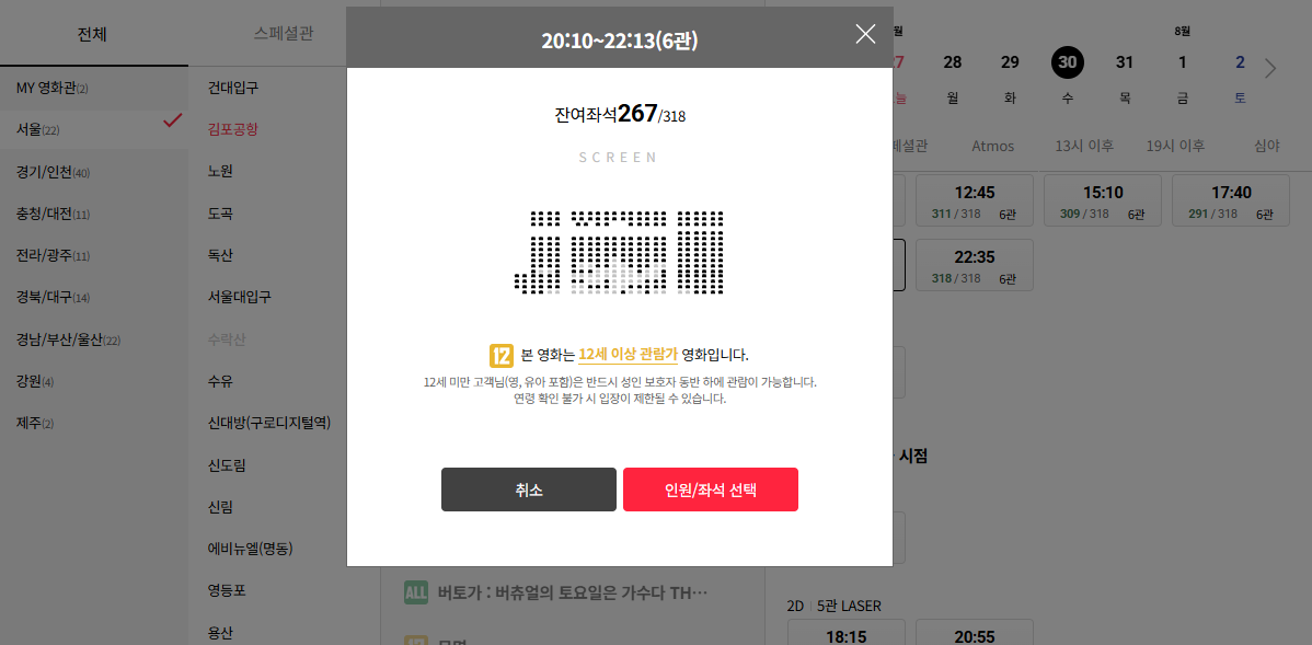 할인 시간대가 아니거나, 2D 일반관이 아닐 경우 할인이 적용되지 않습니다.