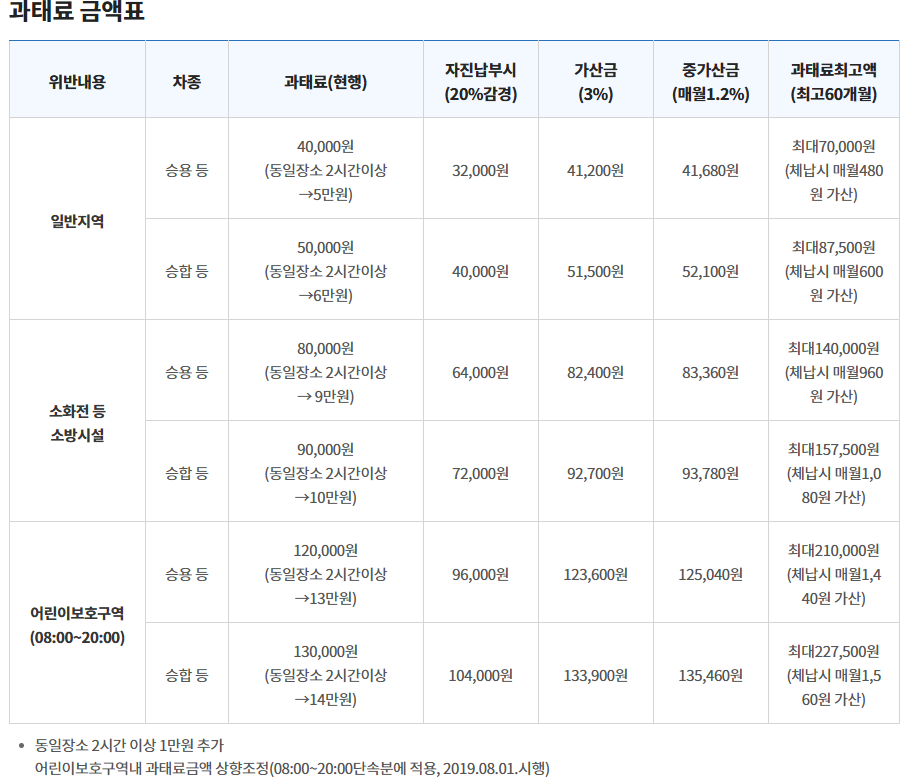 ※ 2024년 7월부터 어린이보호구역 내 불법주차는 과태료가 2배 인상되어 승용차의 경우 120,000원 부과됩니다.