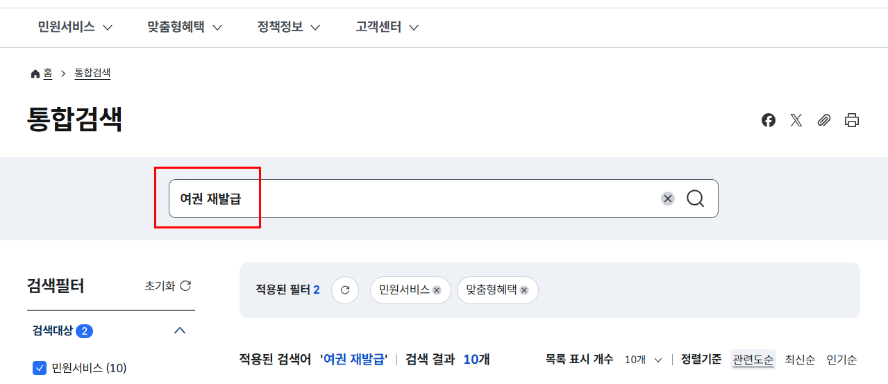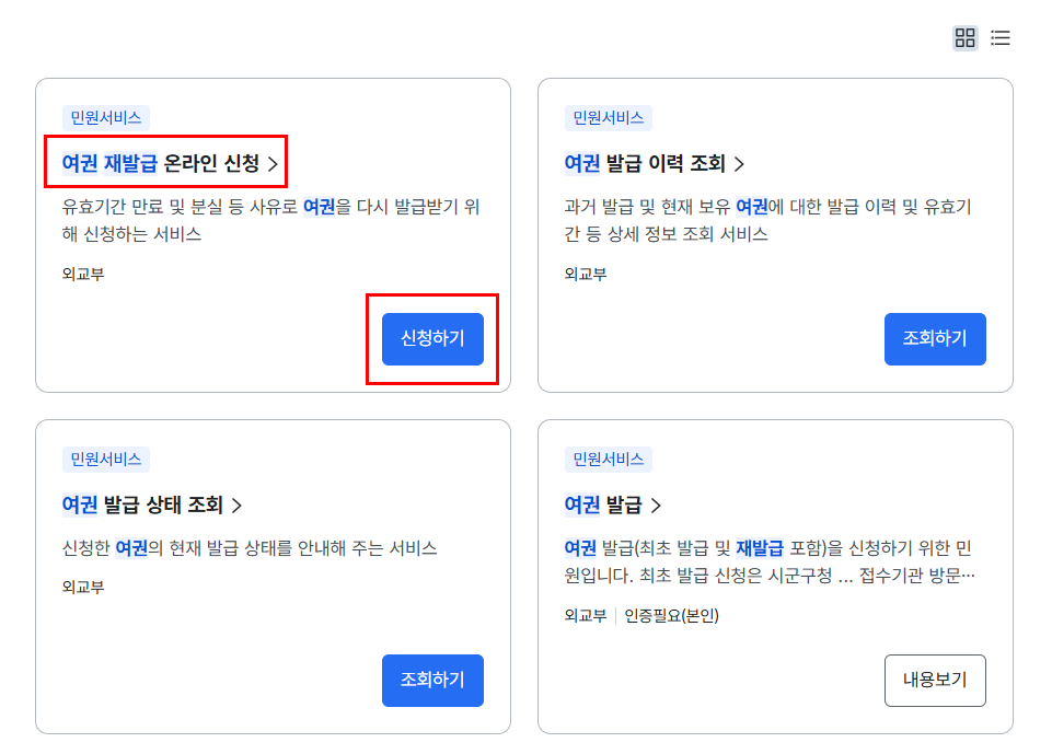 ✅ 메인 화면 상단 검색창에 ‘여권 재발급’ 입력