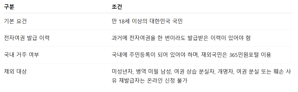 온라인으로 여권 갱신(재발급)을 신청할 수 있는 조건은 다음과 같습니다.