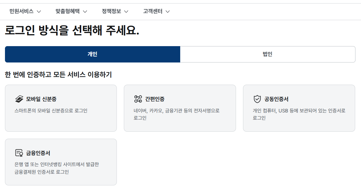 - 본인 인증 수단: 공동인증서, 휴대폰 인증, 또는 카카오·PASS 등 간편인증
