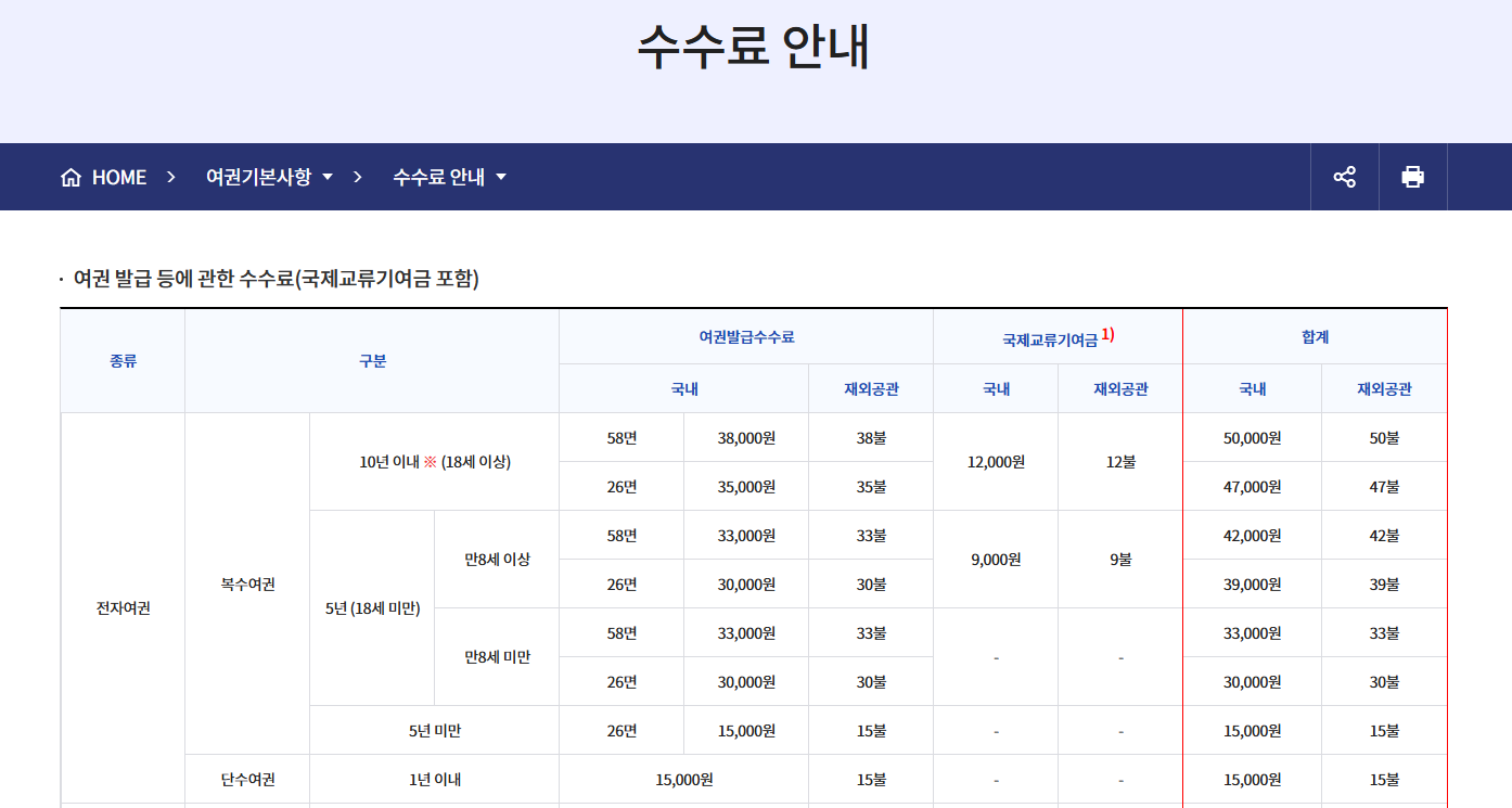 | 복수여권(성인용) | 10년 | 53,000원 |