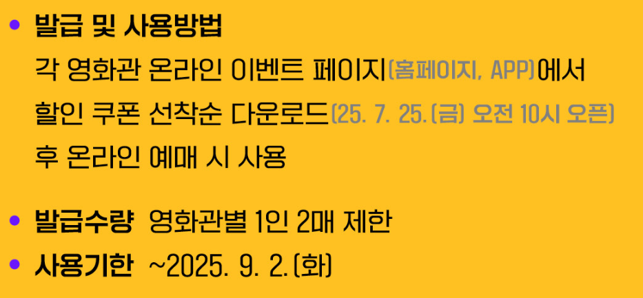 7월 25일 오전 10시, 각 영화관 누리집에서 바로 확인하세요. 선착순 발급이기에 빠른 품절이 예상되오니 꼭 미리 볼 영화를 결정해두세요. “딱 10시 알람 맞춰두고, 로그인 상태에서 대기”는 필수입니다. 이 기회 놓치지 마시기 바랍니다.