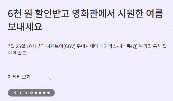 예매 버튼을 누르기 전, 할인쿠폰 발급은 이제 필수! 이번 여름, 영화 한 편으로 기분 전환하고, 똑똑하게 6천 원 아껴보세요.