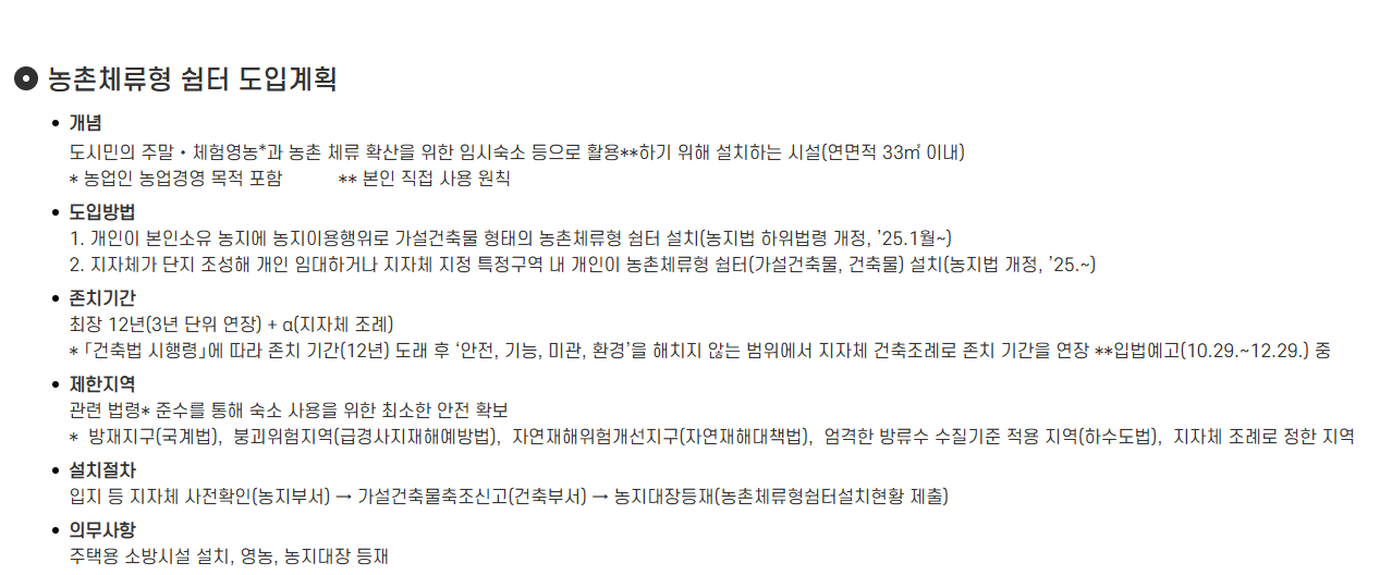 농촌에서의 삶을 준비하거나 체험하고 싶다면, 기존의 농막은 더 이상 충분한 대안이 아닐 수 있습니다. 합법적 체류와 안전한 생활을 원한다면 ‘체류형 쉼터’가 훨씬 현실적이고 안정적인 선택입니다.