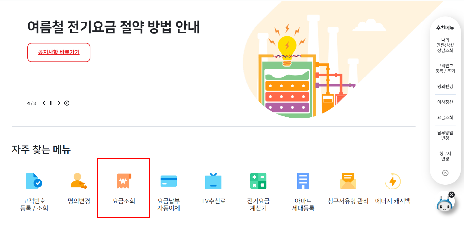 한국전력공사 홈페이지에서 전기요금을 가장 손쉽게 조회하는 방법입니다.