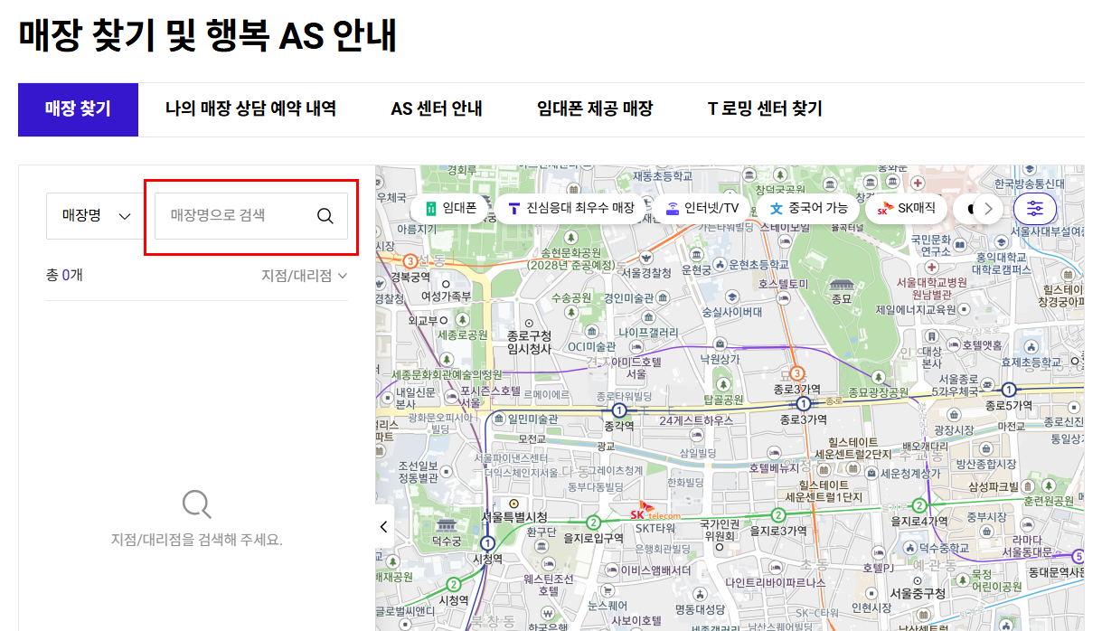 아래와 같은 화면이 나오면 오른쪽 '매장 찾기'를 통해 대리점을 검색하시면 됩니다.